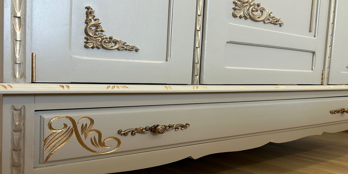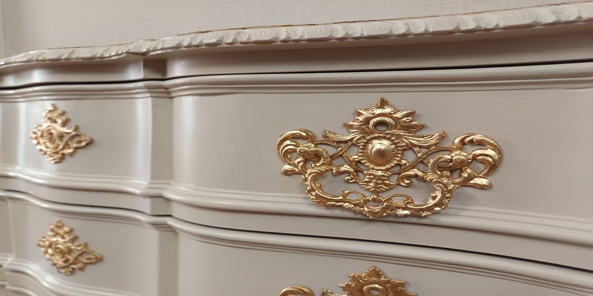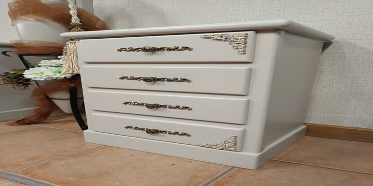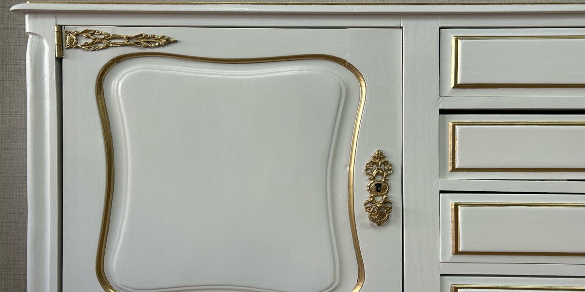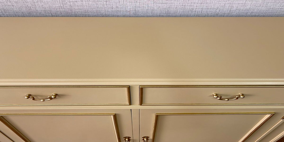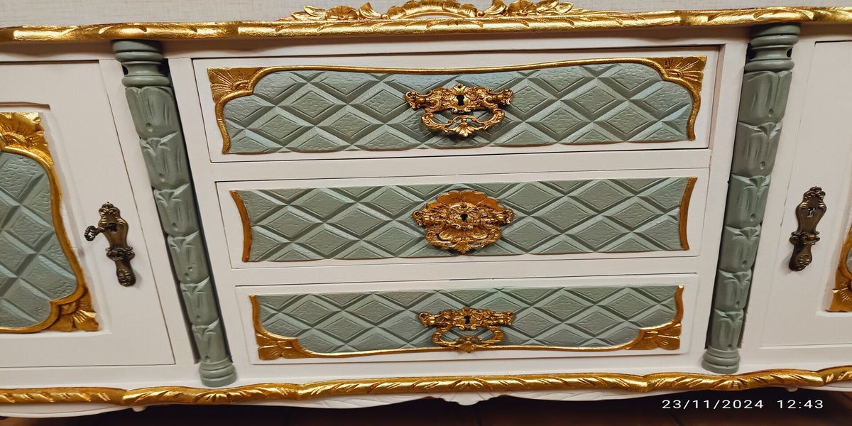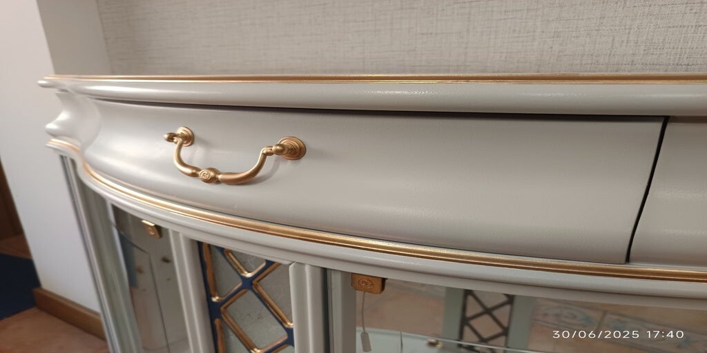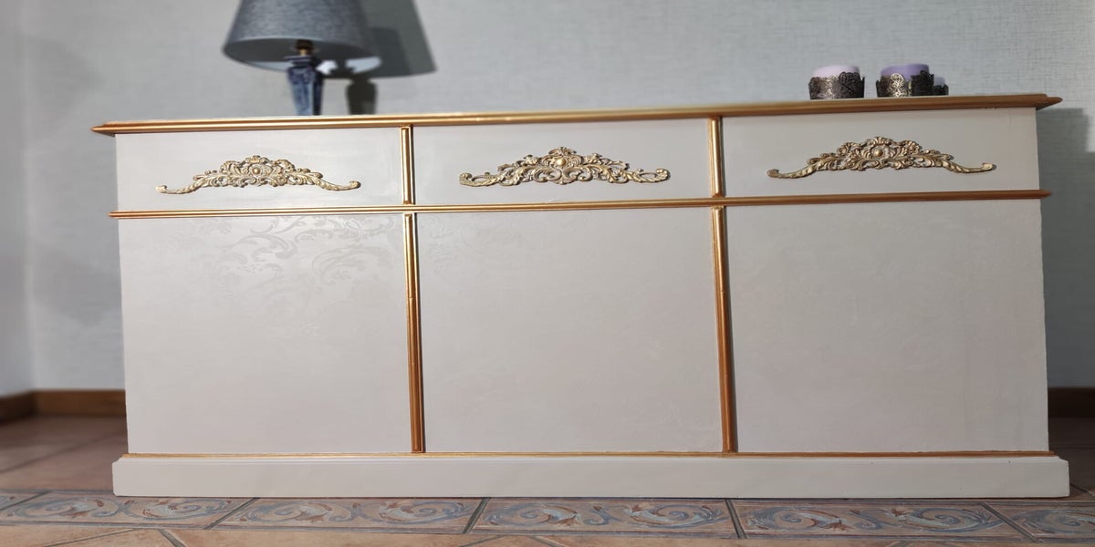 Guarda Fatos renovado em beje e dourado. Puxadores novos, aplicação de molduras de canto e revestimento interior da gaveta em papel