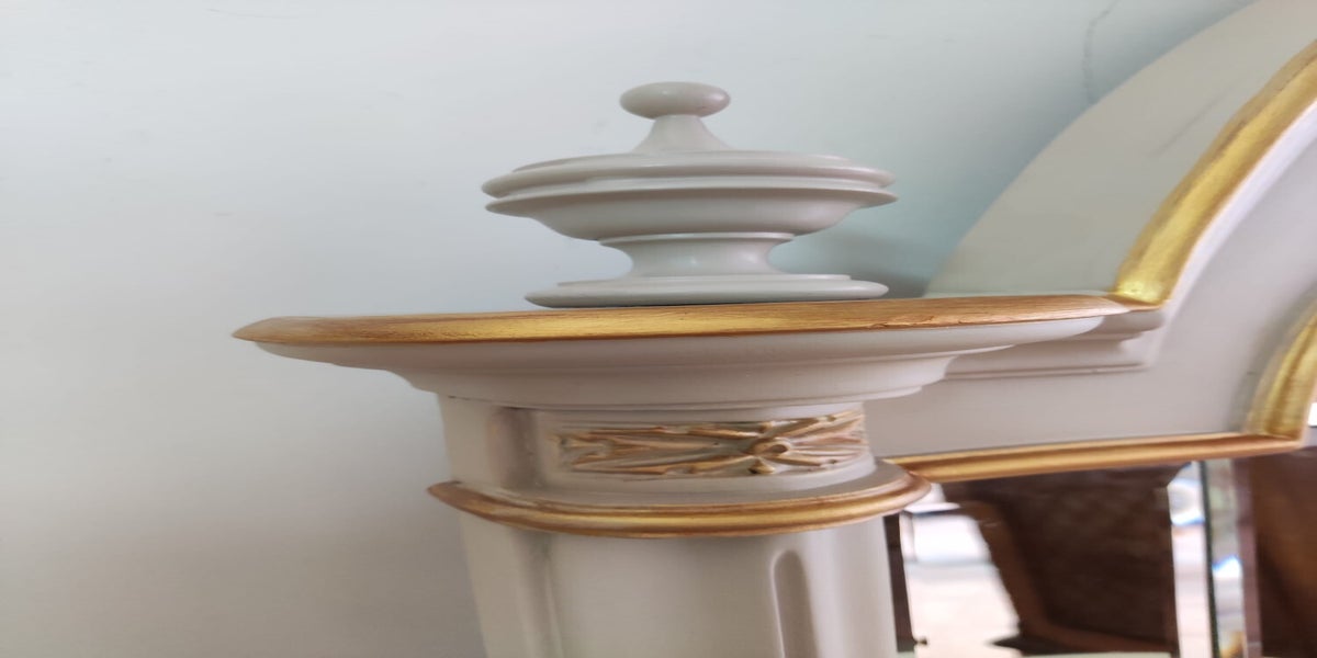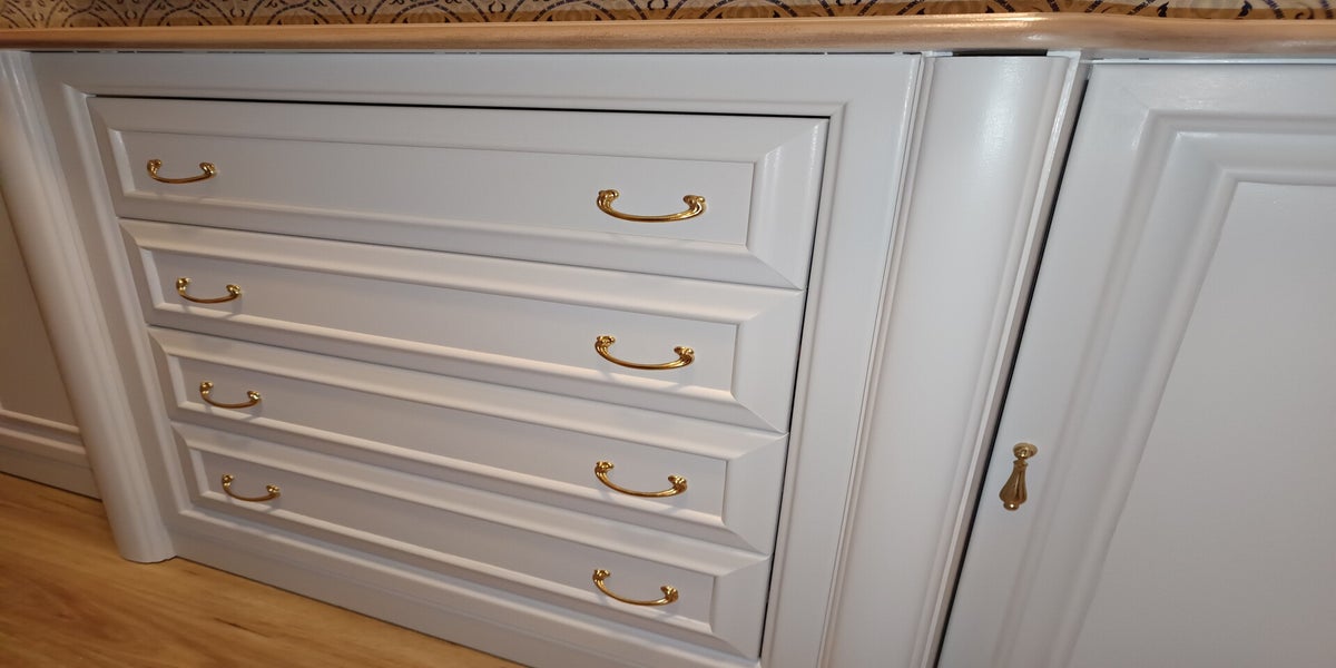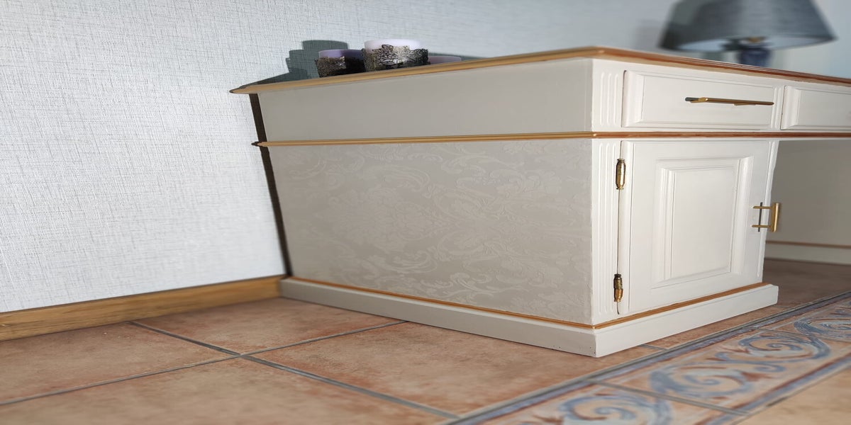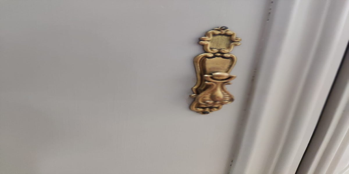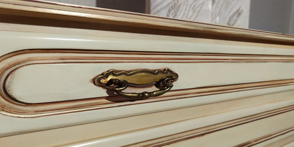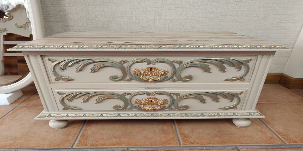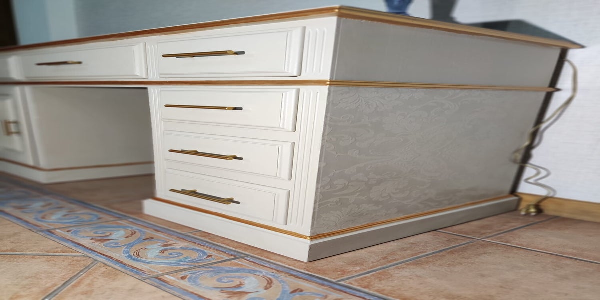 Guarda Fatos renovado em beje e dourado. Puxadores novos, aplicação de molduras de canto e revestimento interior da gaveta em papel