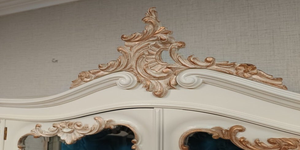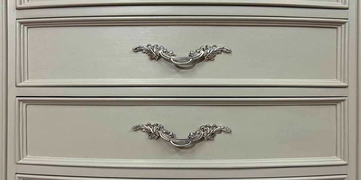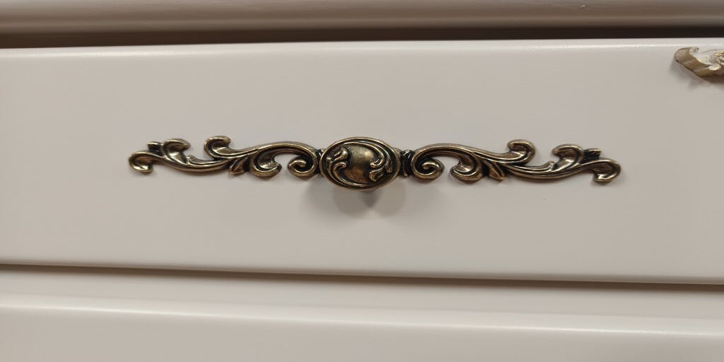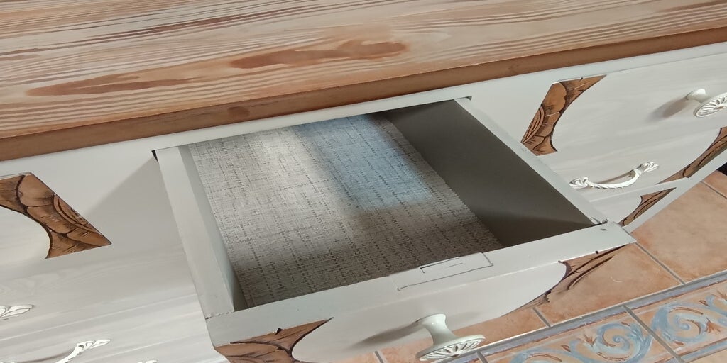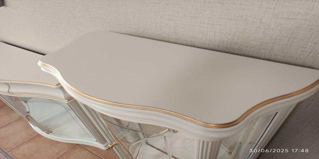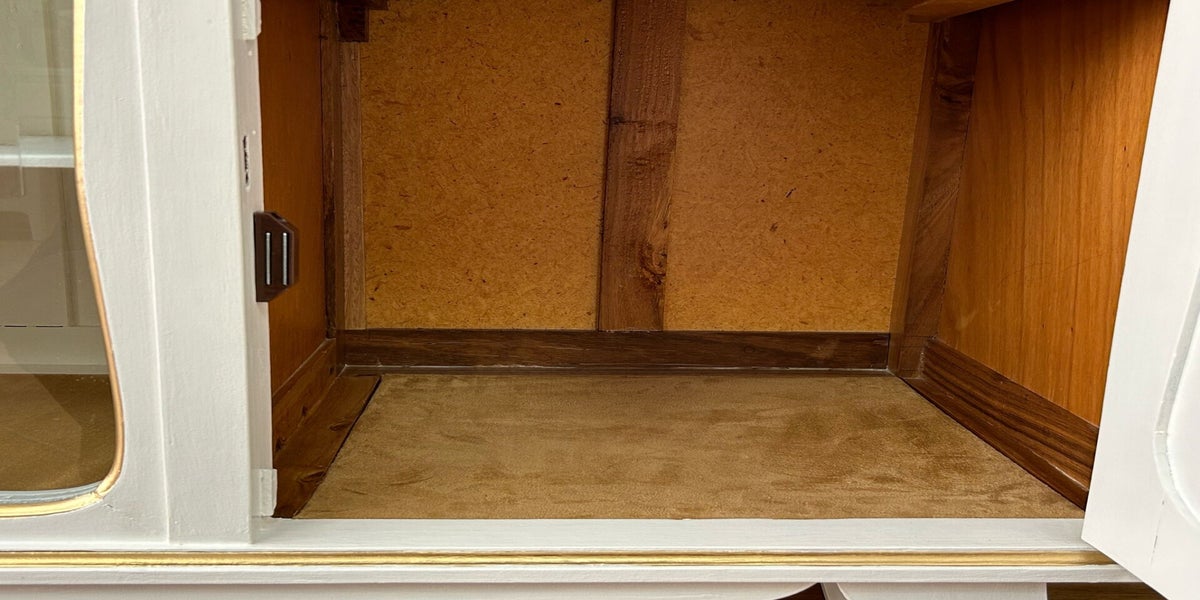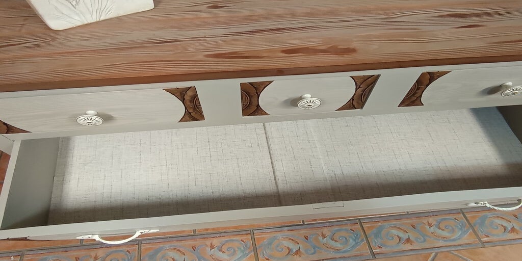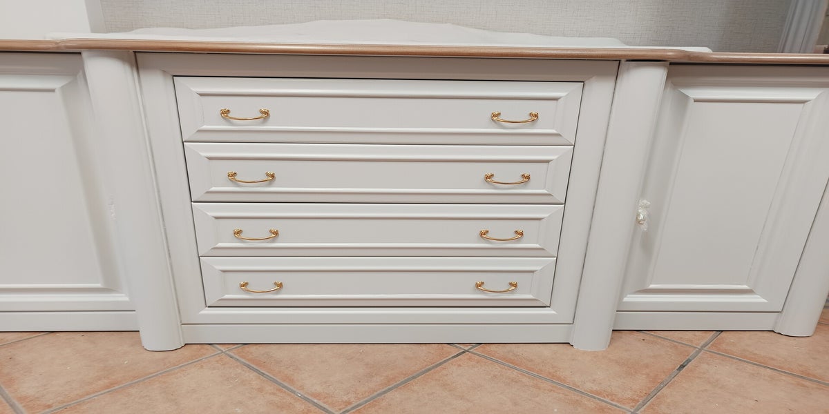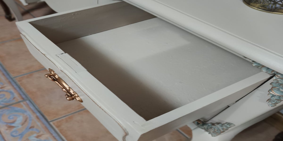 Guarda Fatos renovado em beje e dourado. Puxadores novos, aplicação de molduras de canto e revestimento interior da gaveta em papel