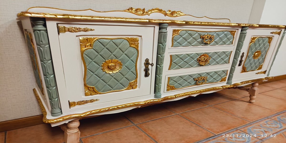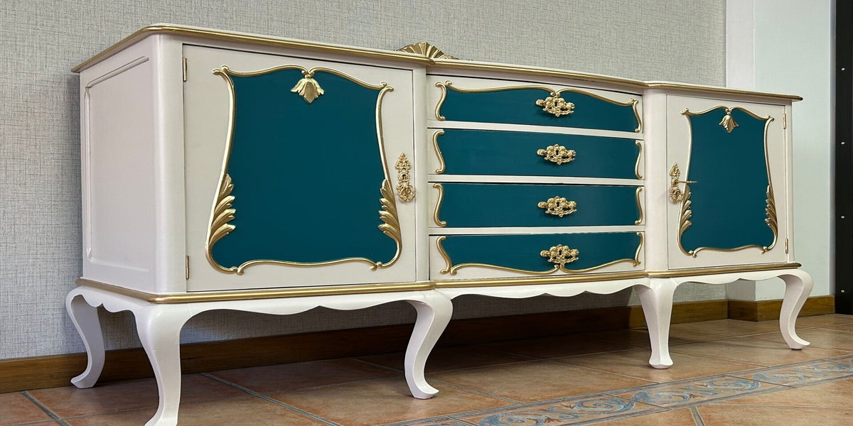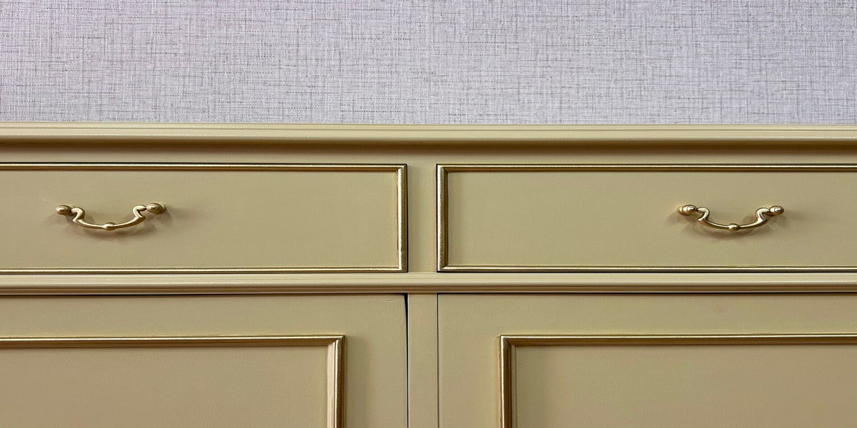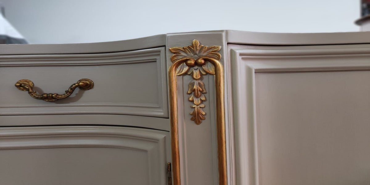 Aparador estilo Queen Ann customizado em bege e verde com detalhes em dourado.