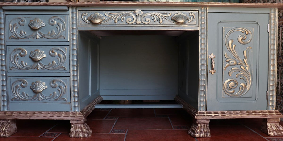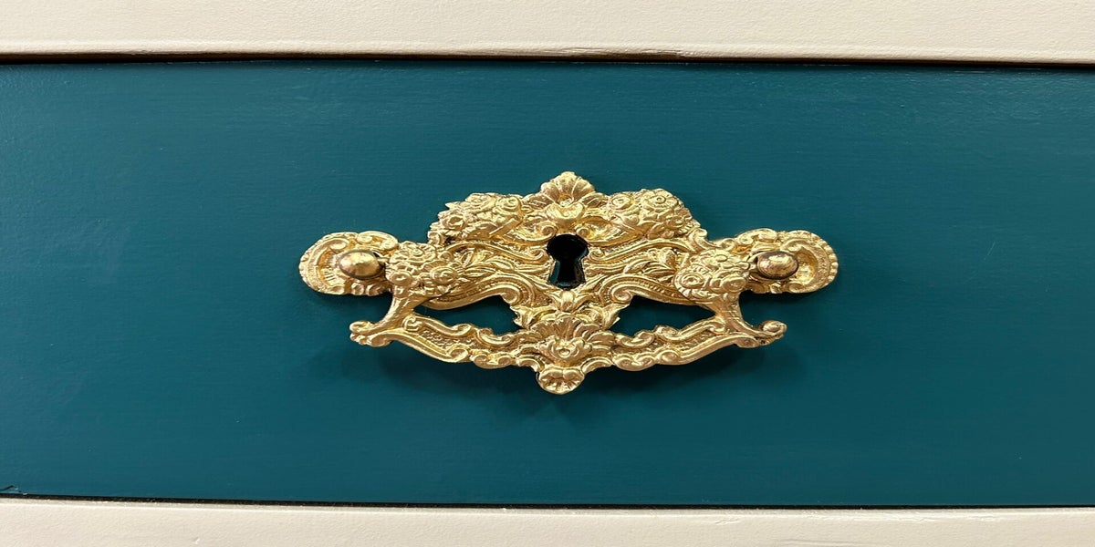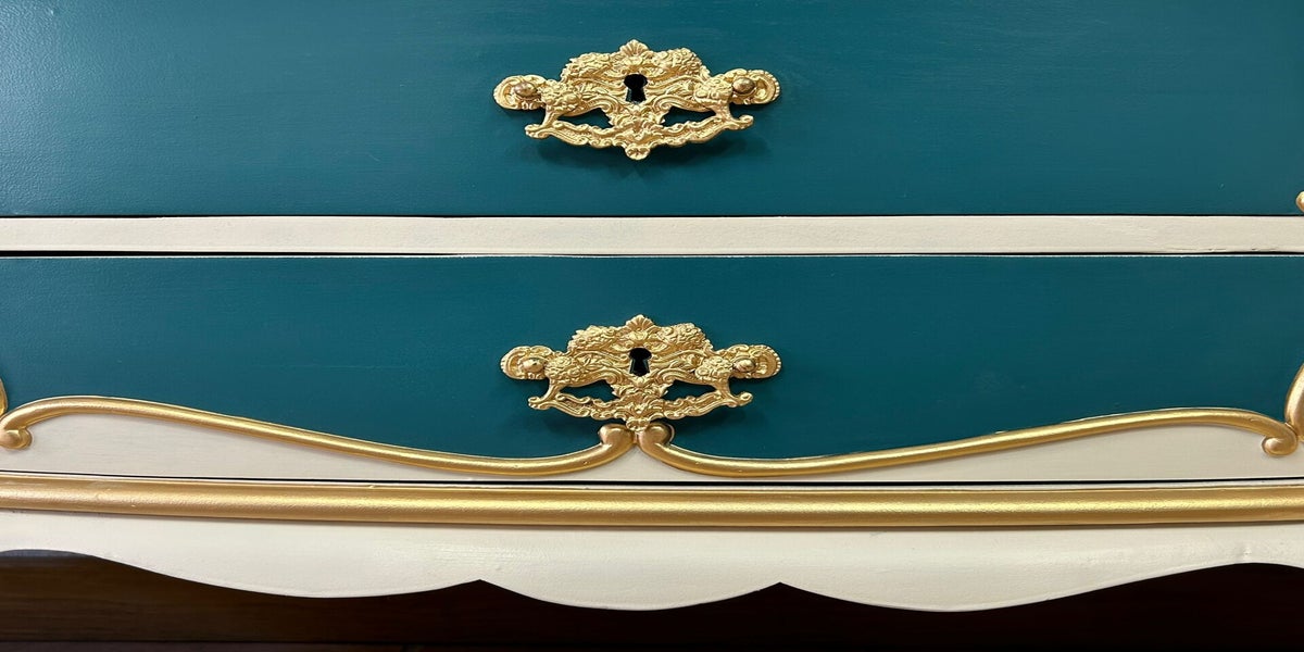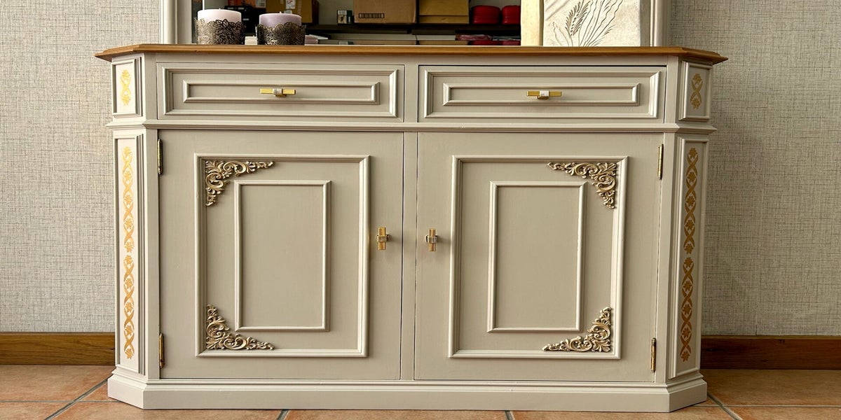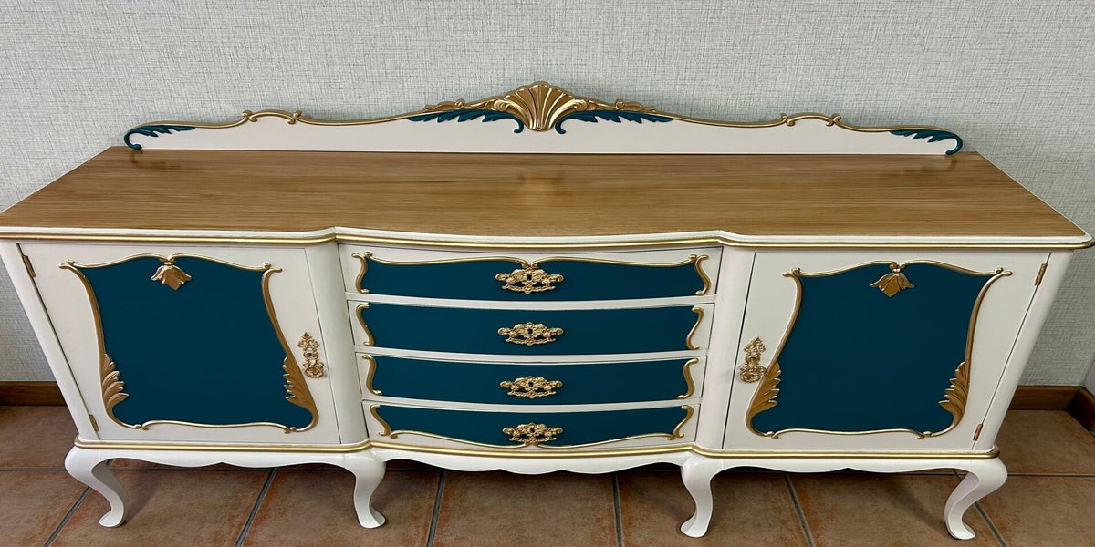 Aparador estilo Queen Ann customizado em bege e verde com detalhes em dourado.