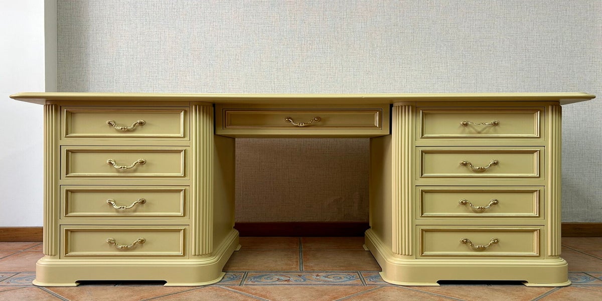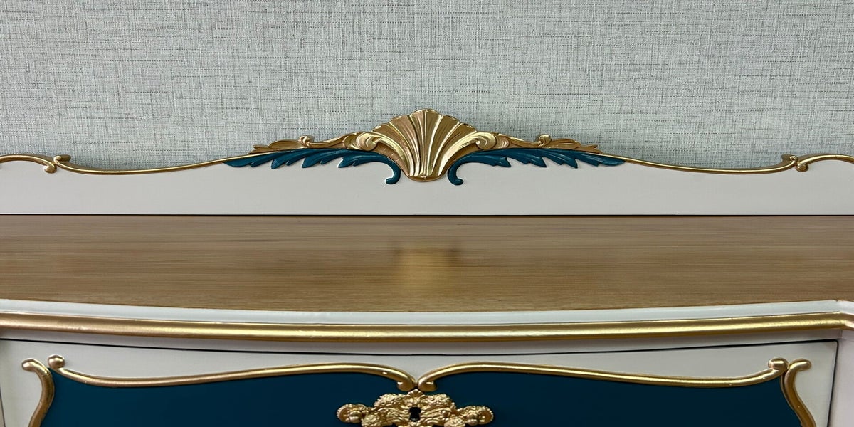 Aparador em bege e verde com aplicação de folha de ouro e tampo em efeito nogueira.