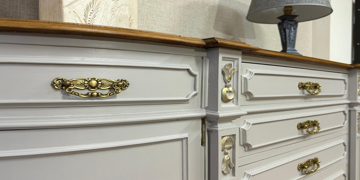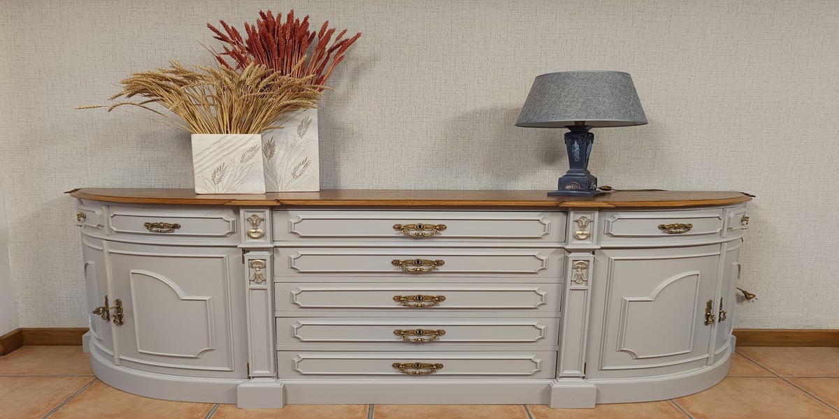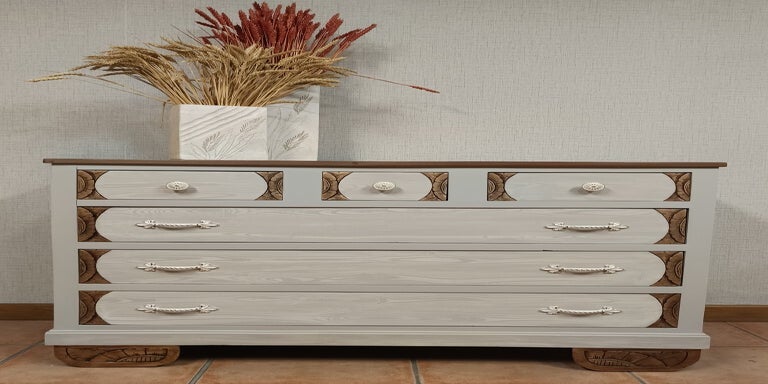 Entre tons de cinza suave e madeira quente, esta cómoda renasceu com serenidade.