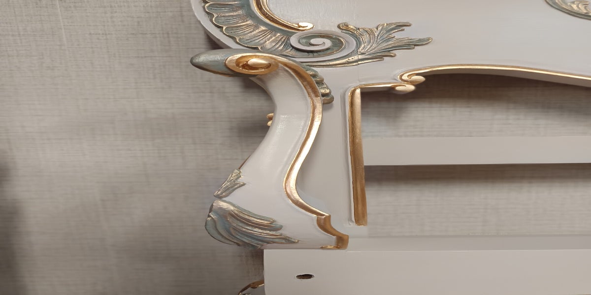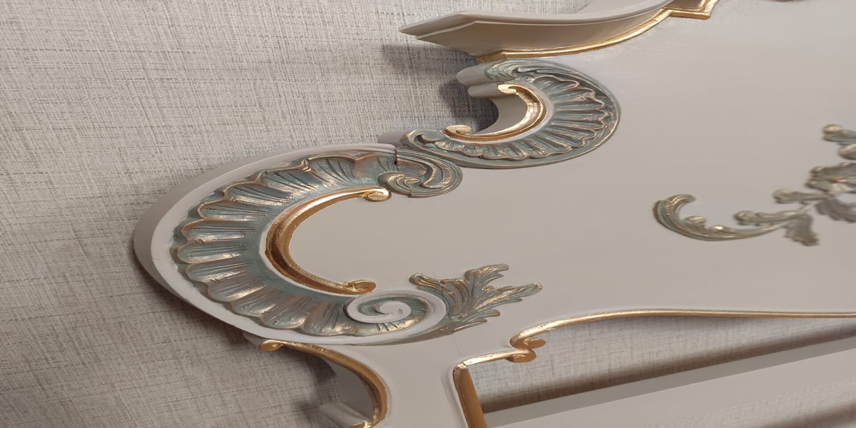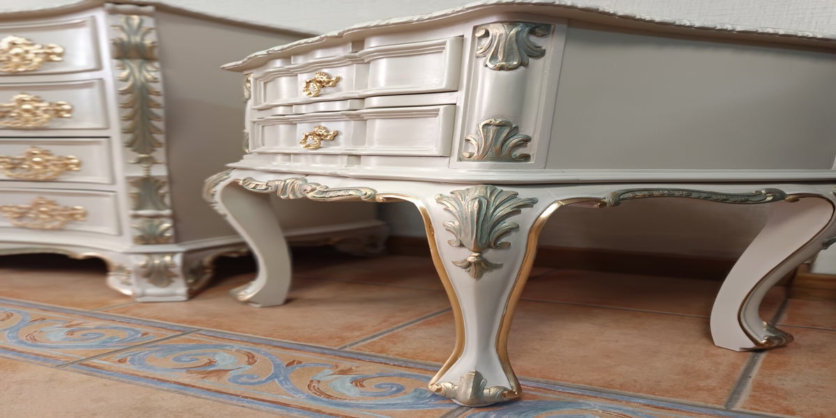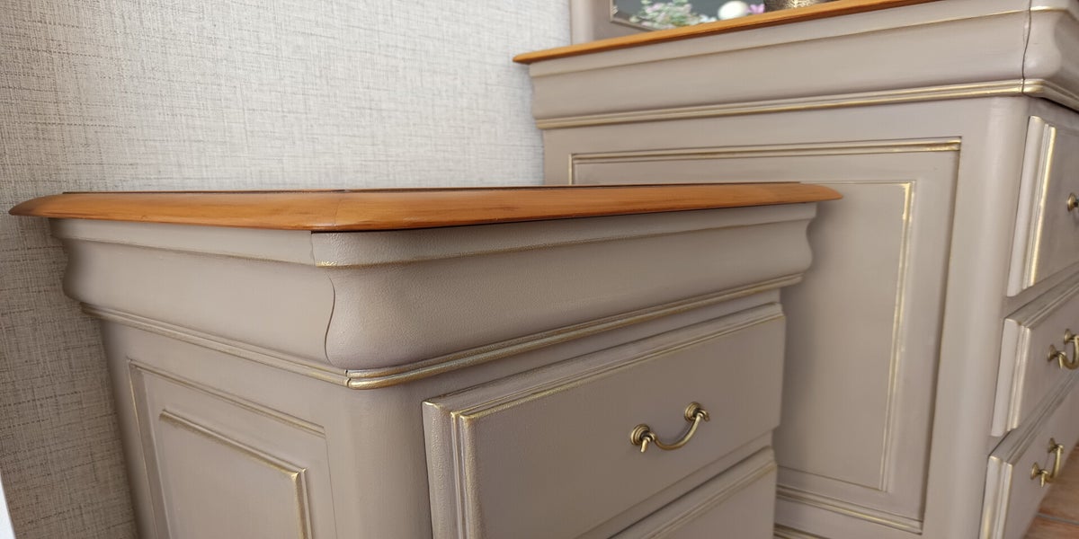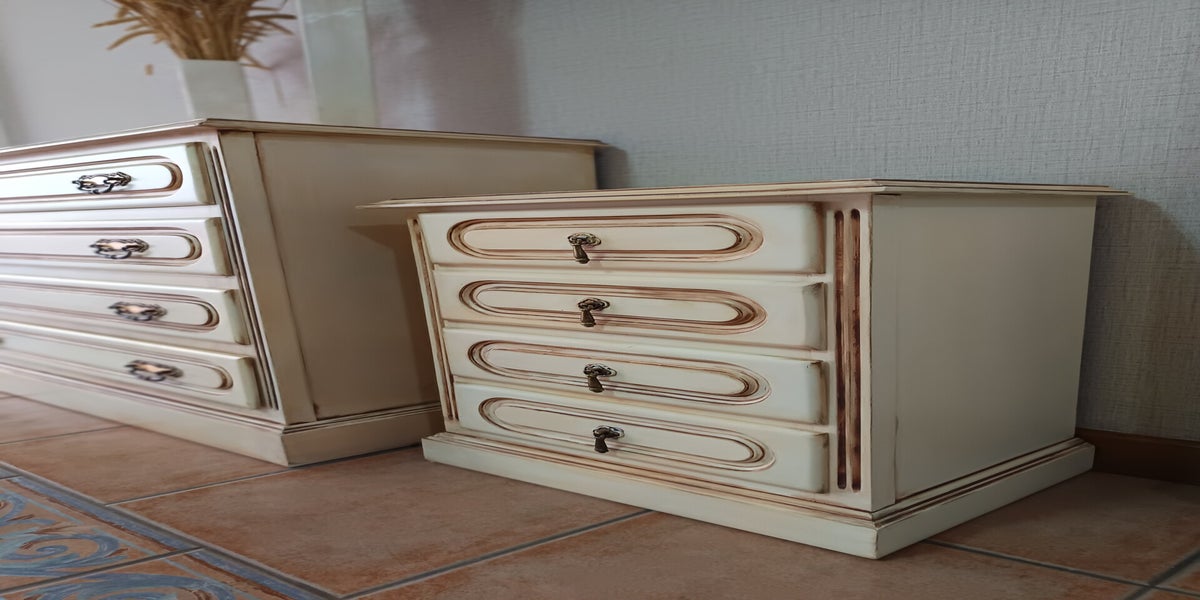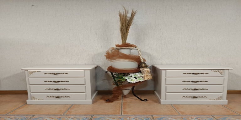 Dê nova vida ao seu quarto com o nosso restyling de móveis — um trabalho artesanal que transforma mesinhas de cabeceira pintadas em bege com apliques dourados elegantes.