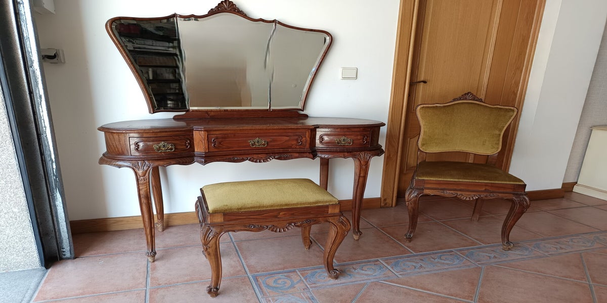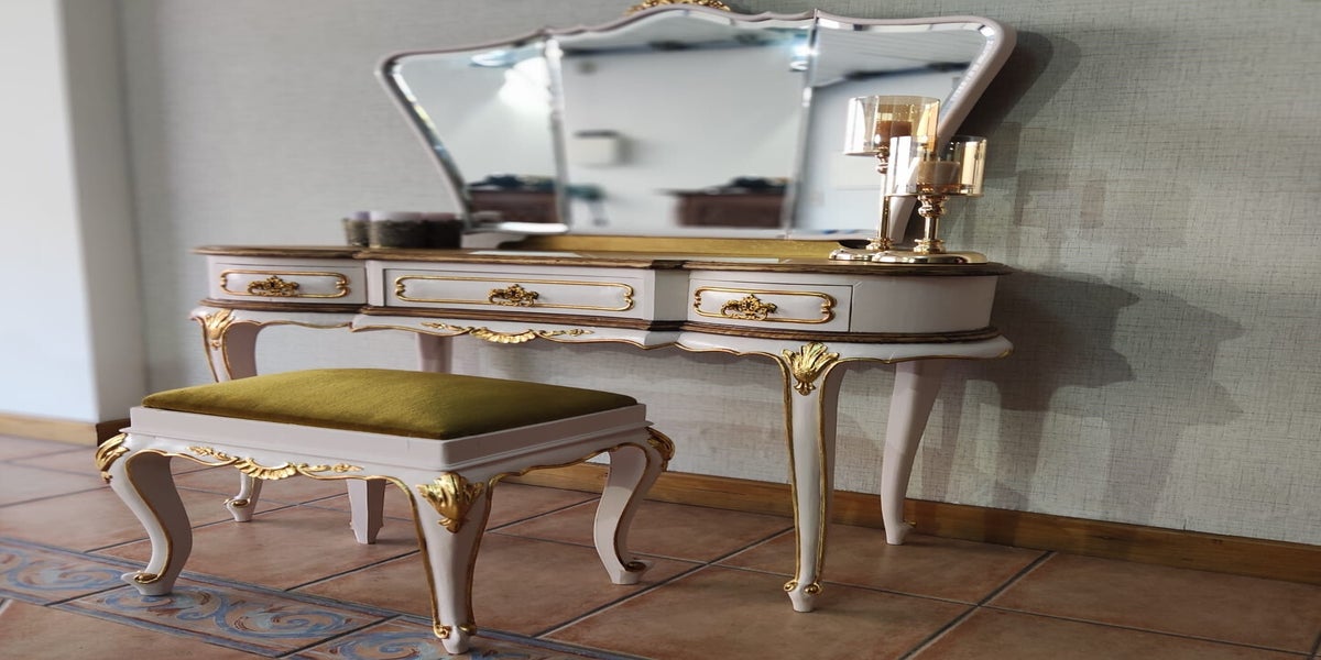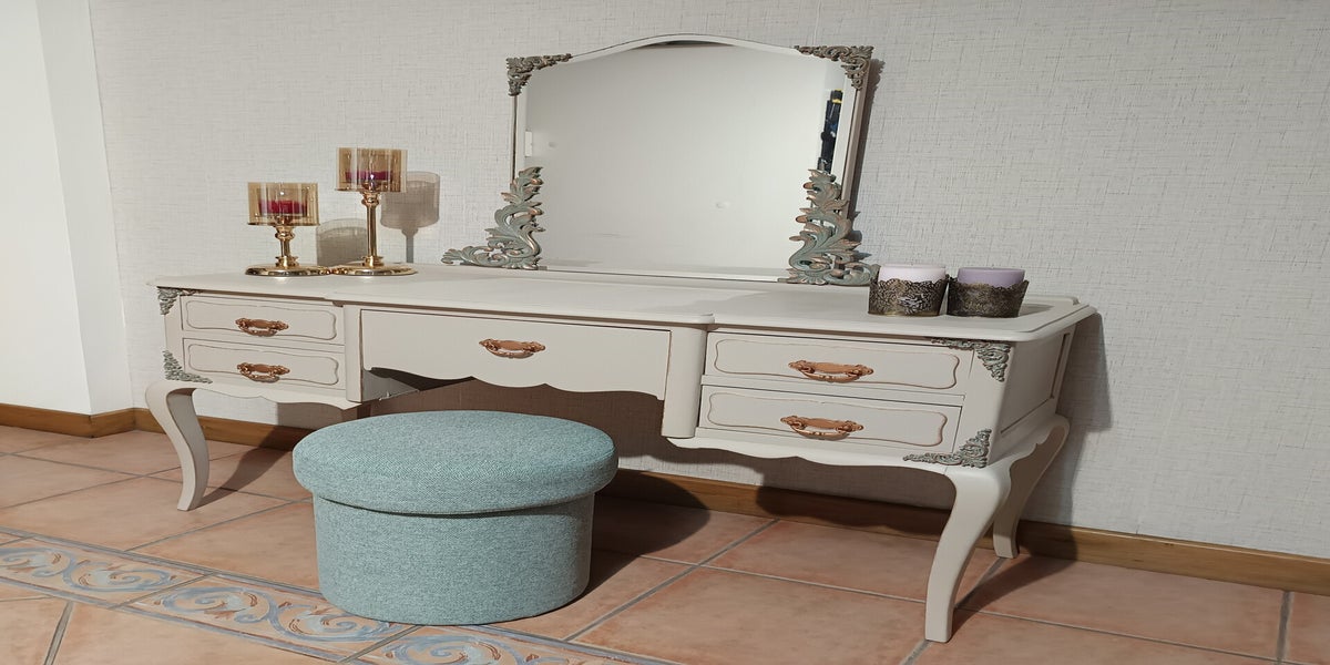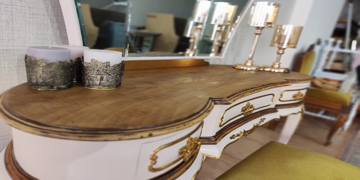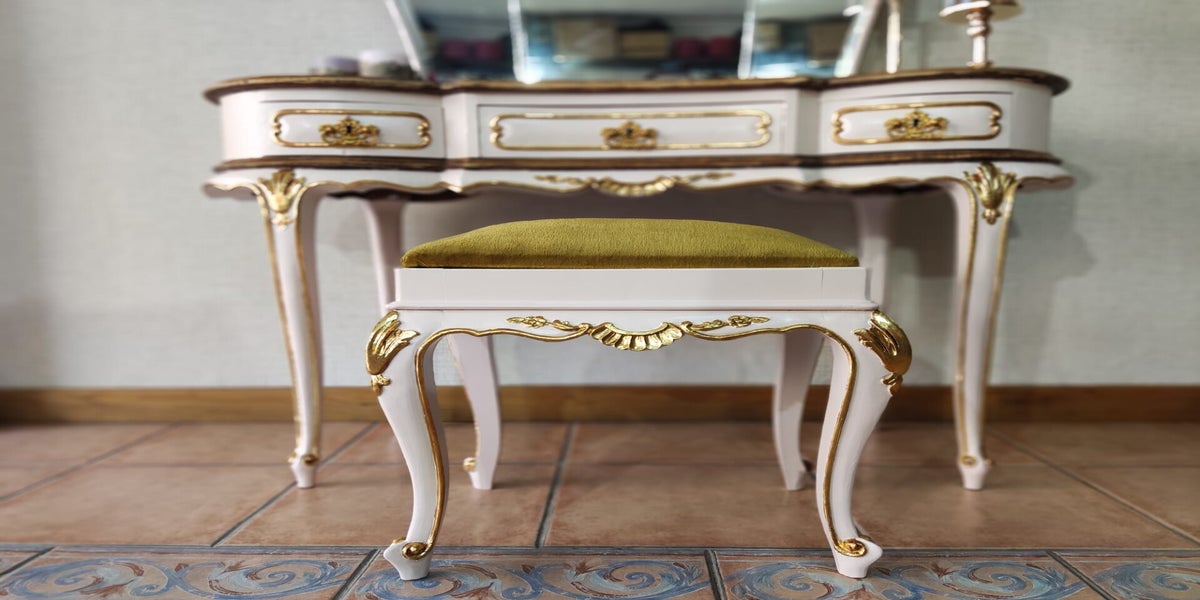 Penteadeira / Toucador em bege com dourados e pormenores em verde.