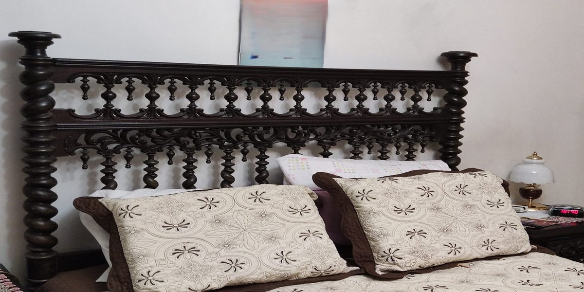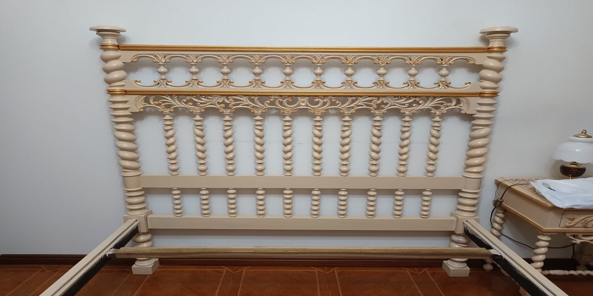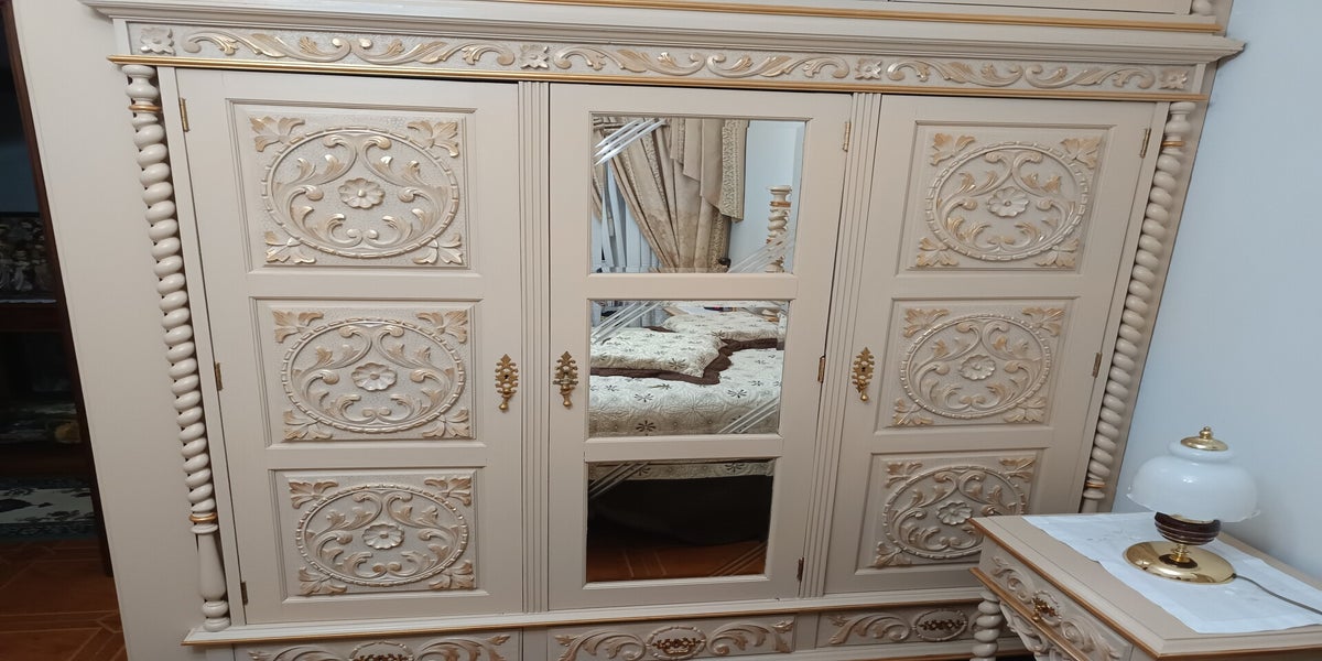Conjunto de quarto: Cómoda, mesinhas de cabeceira, cama e guarda fatos em tom bege e dourado com ênfase no trabalho em relevo. Pode-se observar o aspeto inicial e o final após a nossa intervenção.