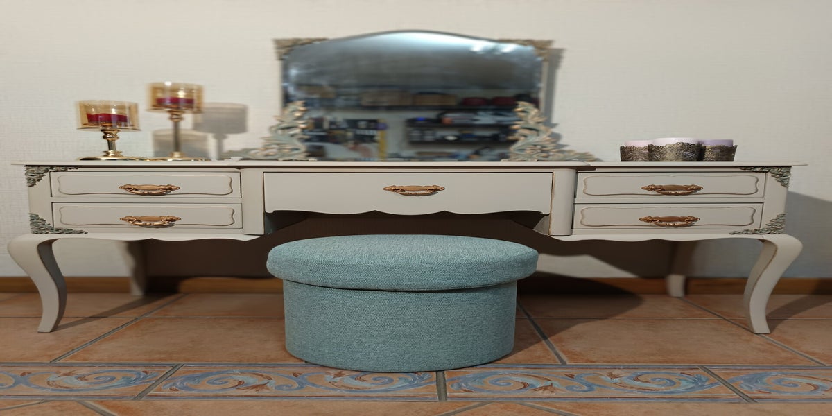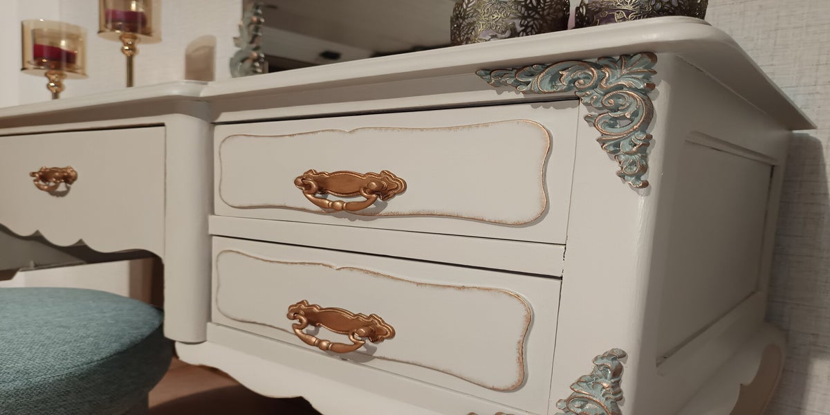 Penteadeira / Toucador em bege com detalhes em verde e nuances em cobre.