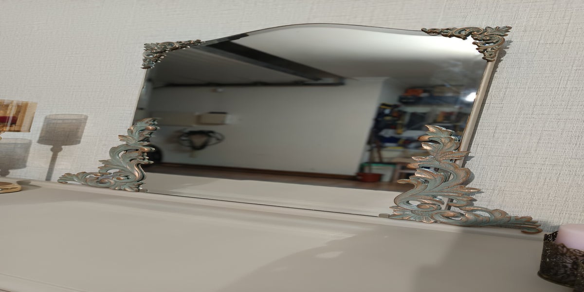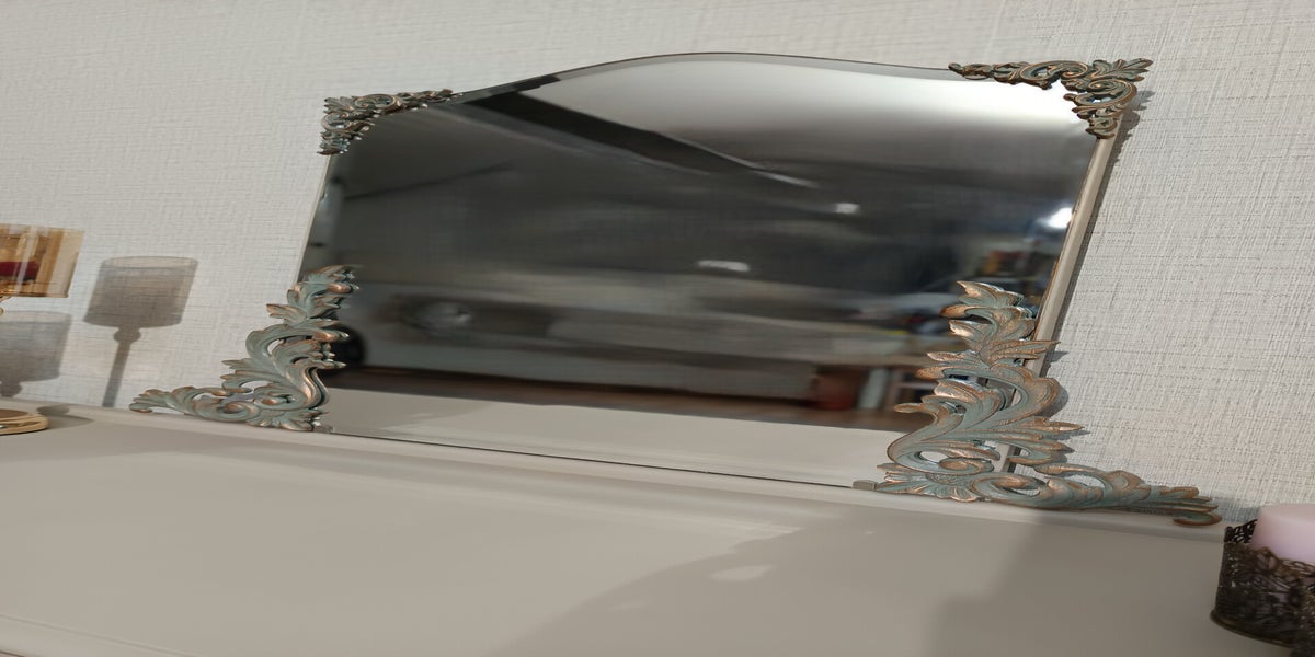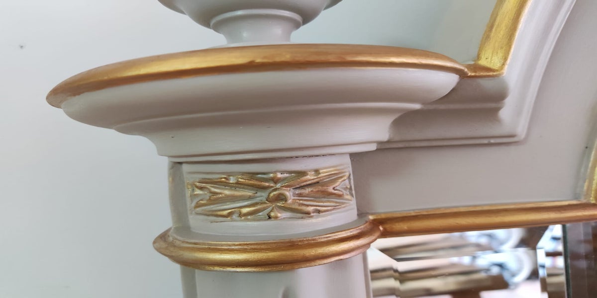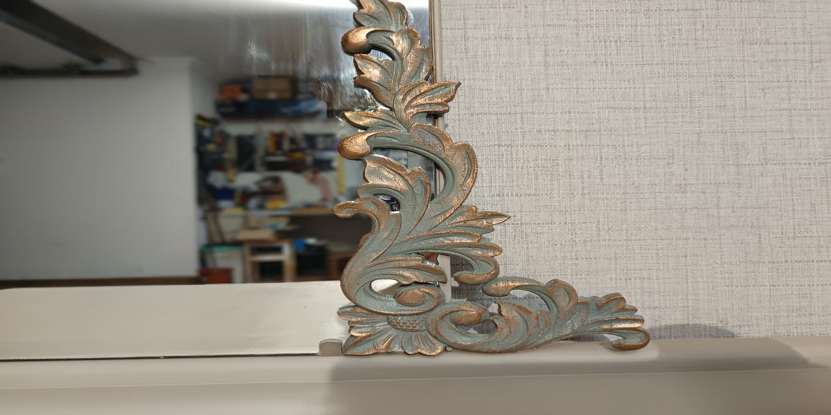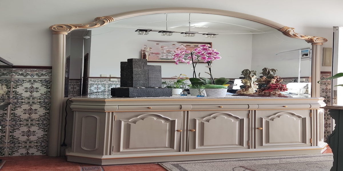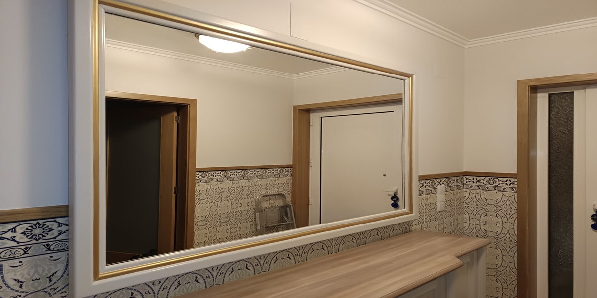 Espelho renovado com as cores do aparador e aplicação de molduras de canto para um resultado final elegante e distinto.