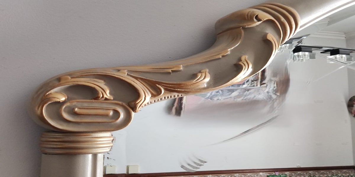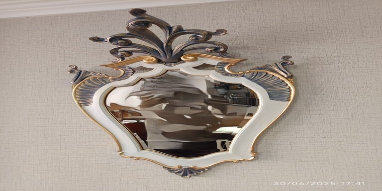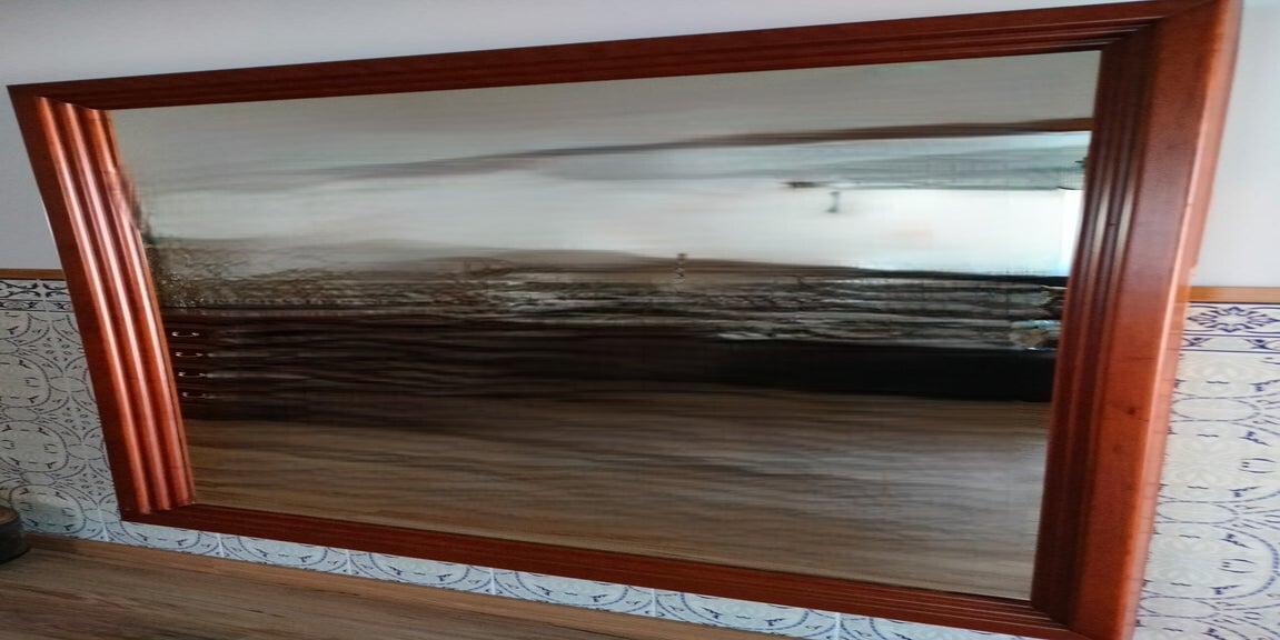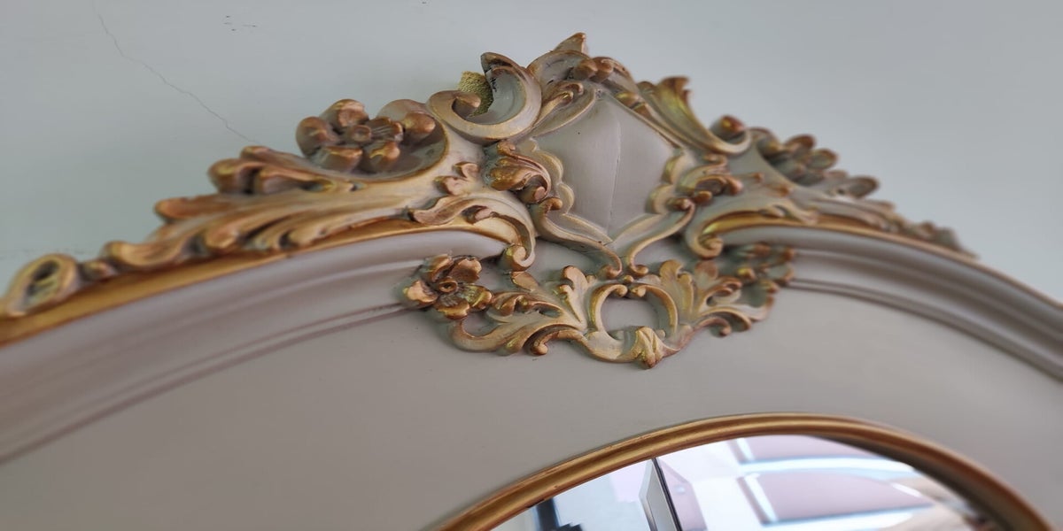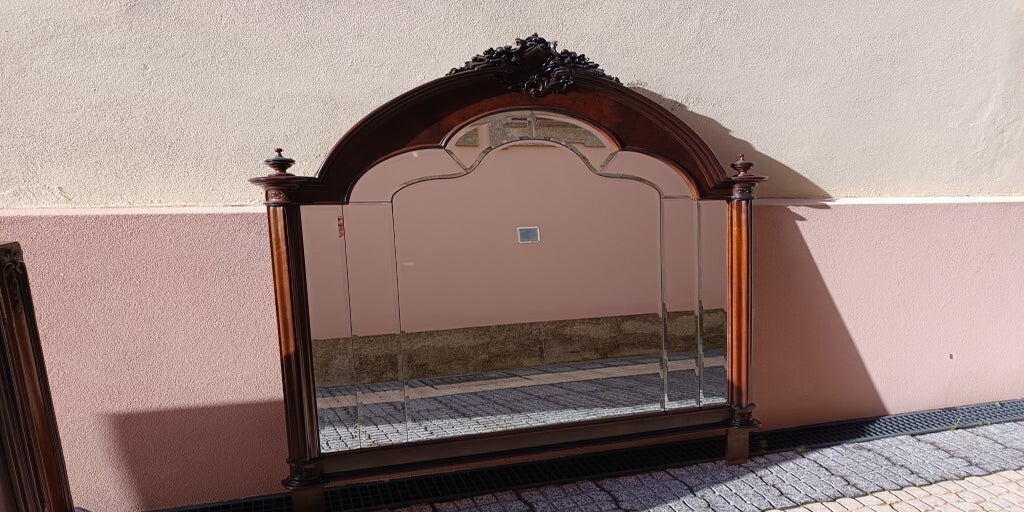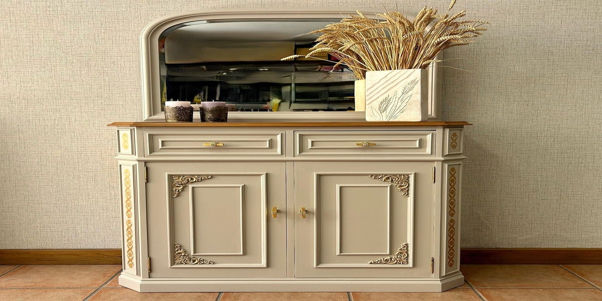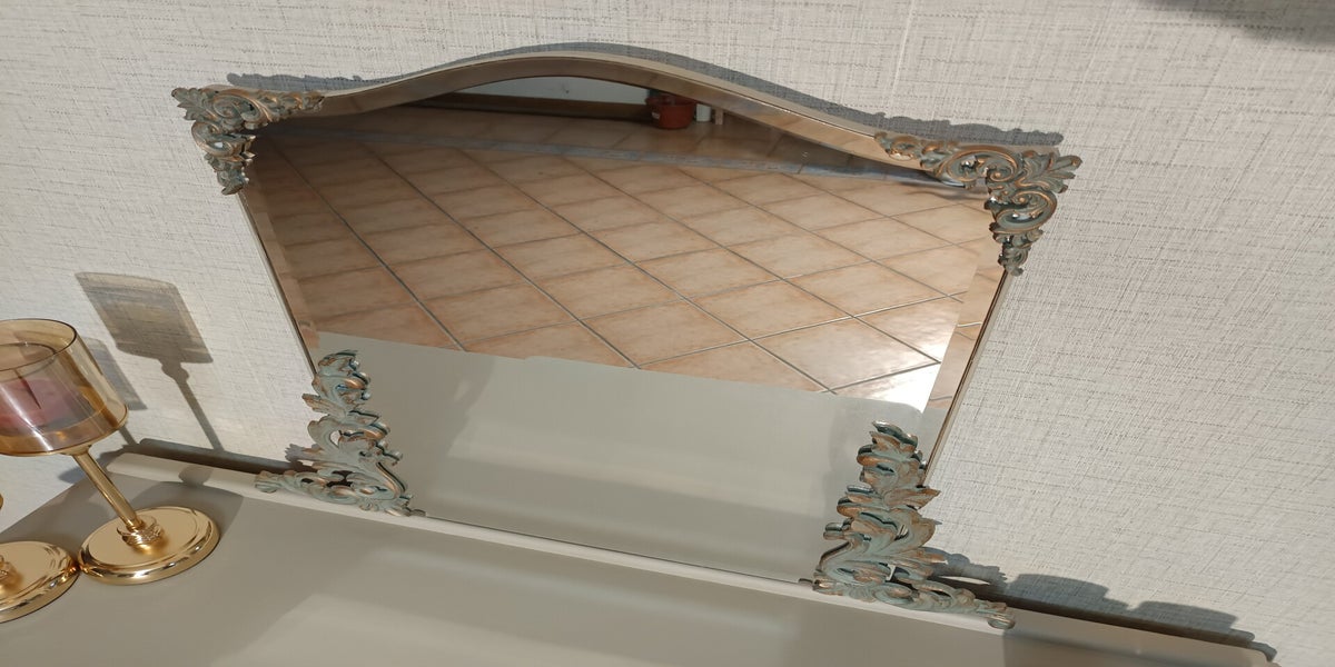 Espelho renovado com as cores do aparador e aplicação de molduras de canto para um resultado final elegante e distinto.