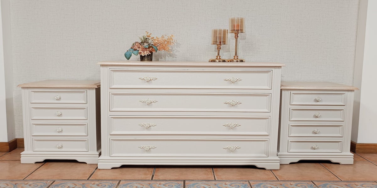Cómoda e mesinhas de cabeceira em bege/baunilha e apontamentos em castanho.