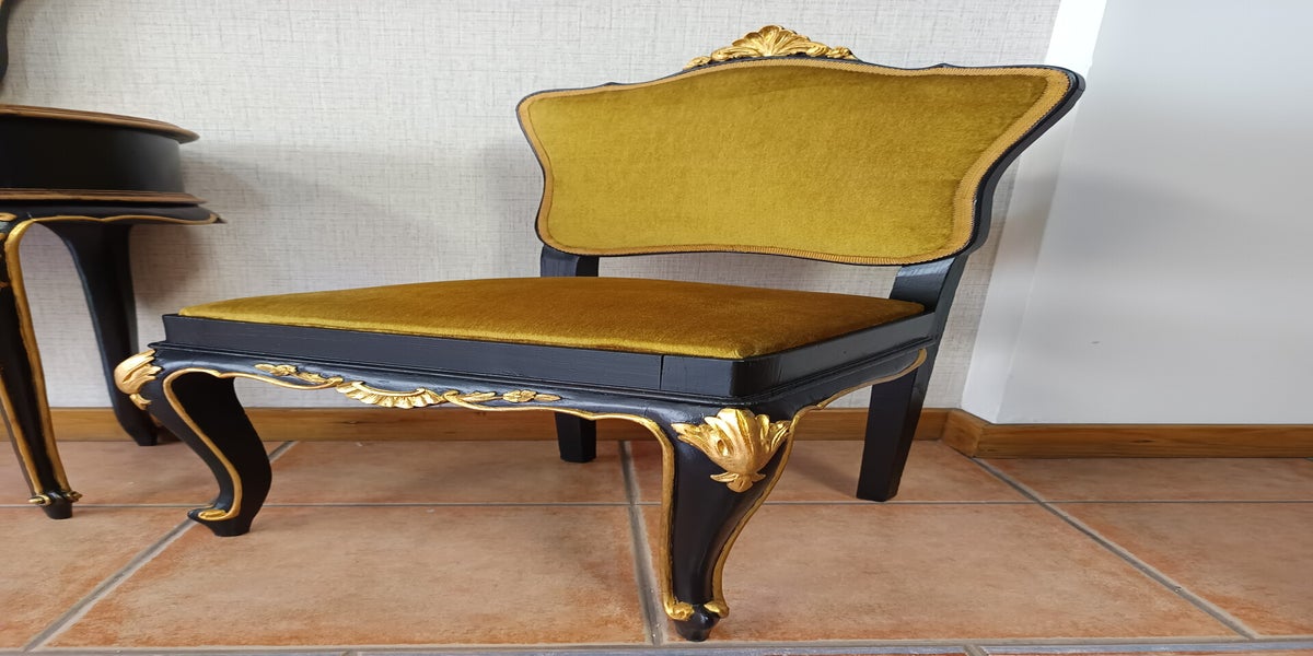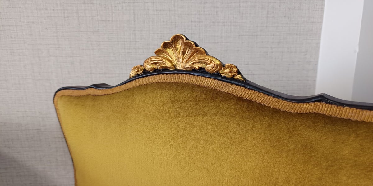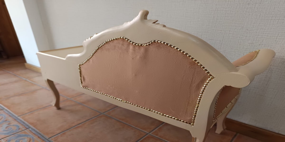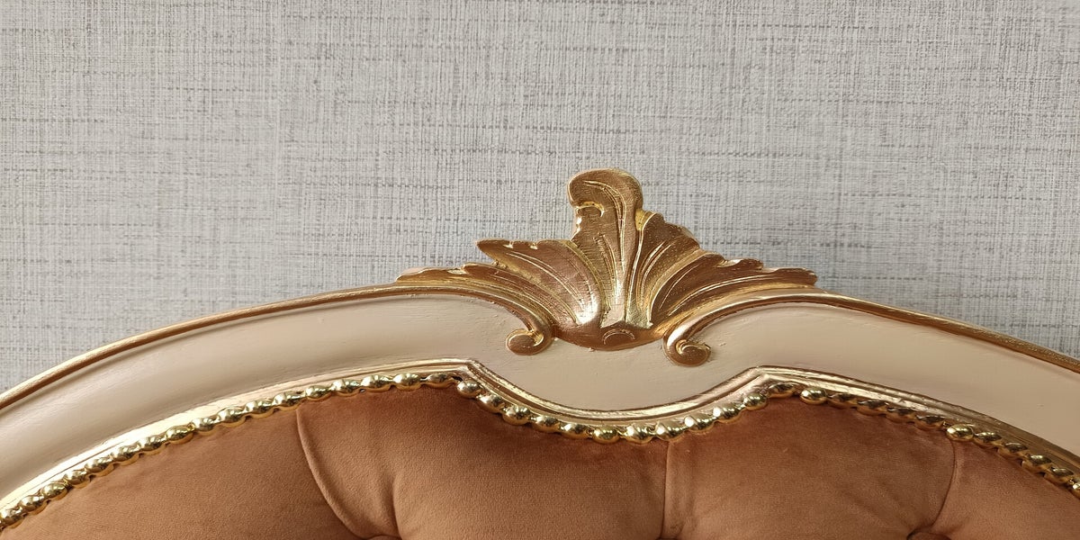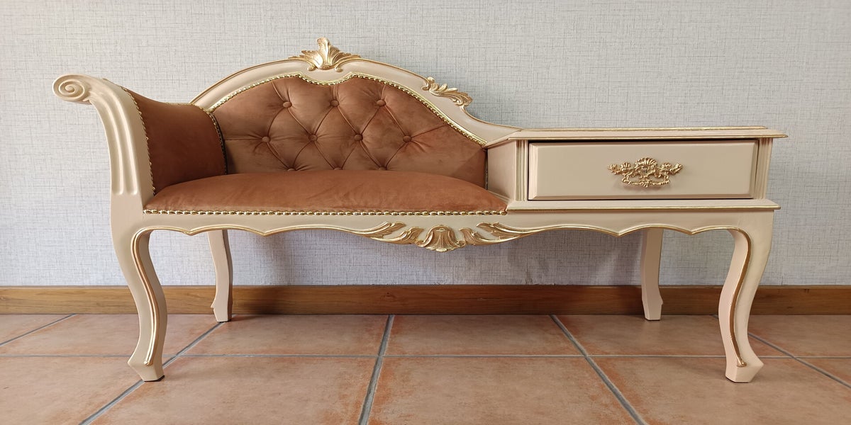 Namoradeira renovada em bege, estofo novo em tecido aveludado em tom de cobre e apontamentos em dourado.