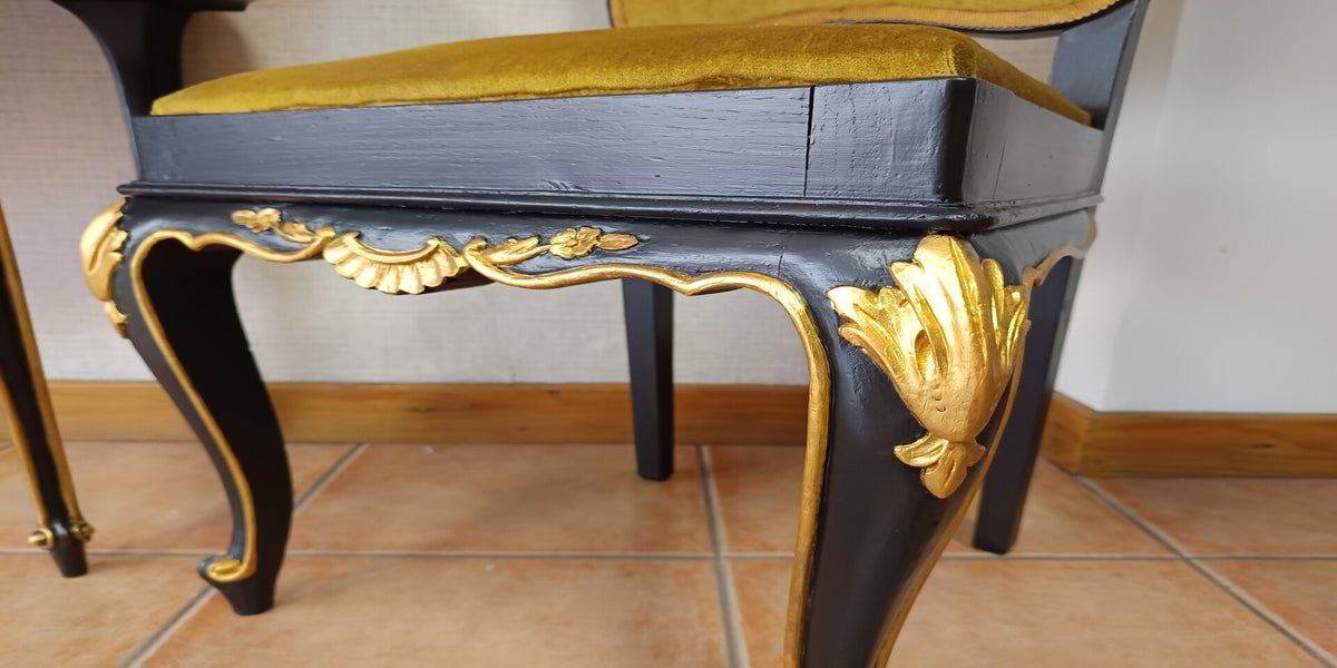 Cadeirão renovado com madeira pintada em verde com detalhes em dourado e estofo novo em tecido bege