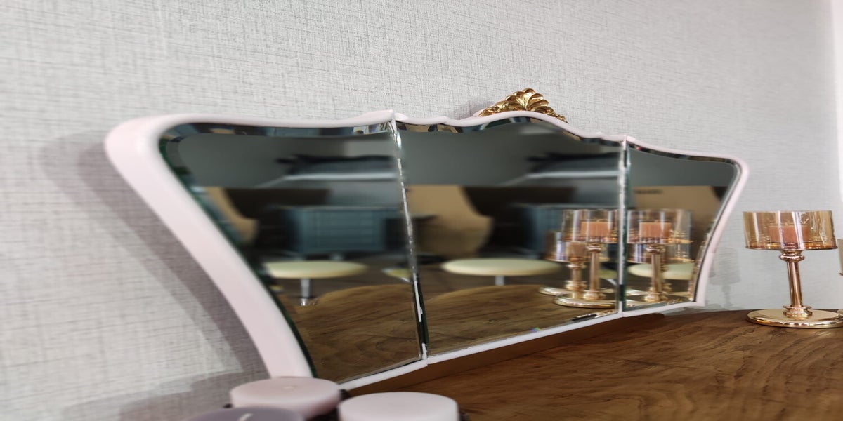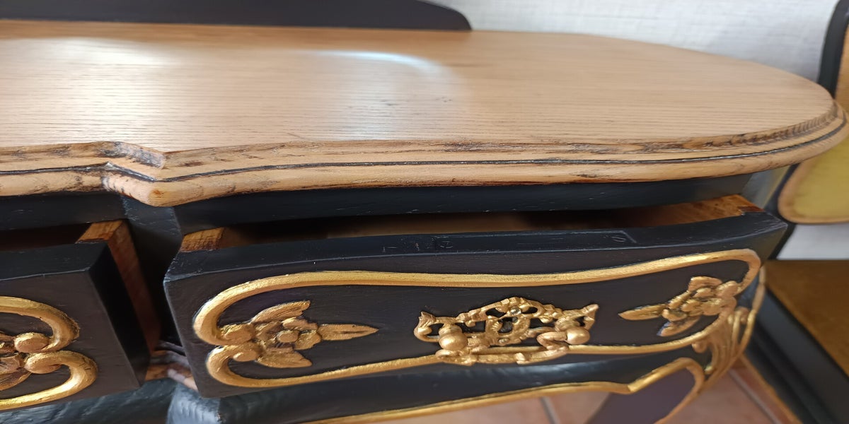 Penteadeira / Toucador em tons de rosa com aplicação de folha de ouro em contraste com o tampo em madeira.