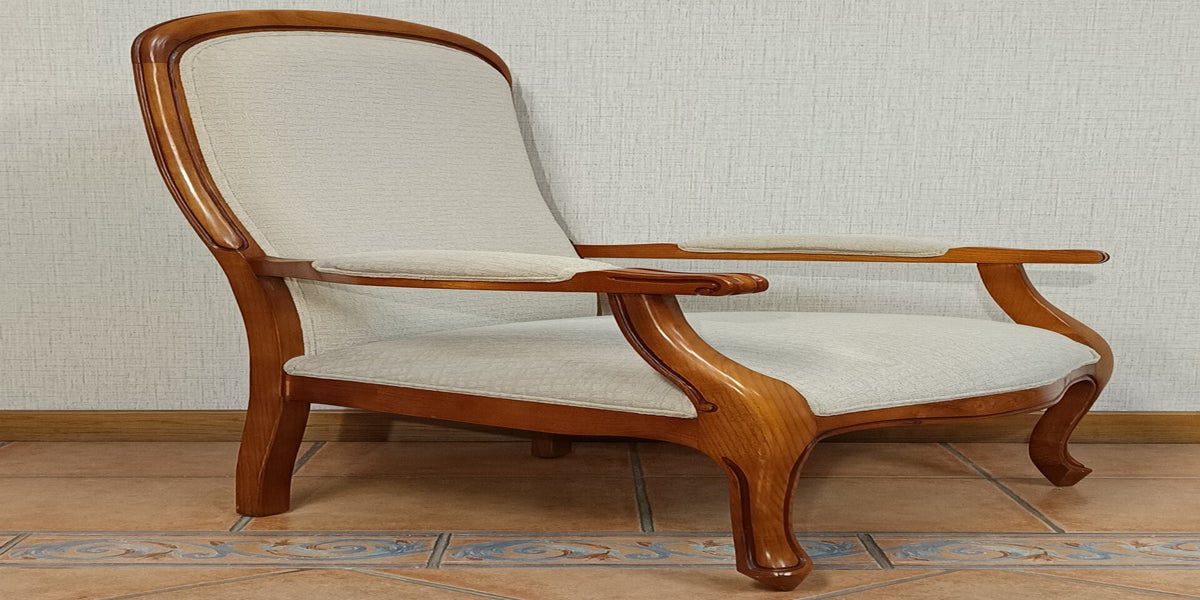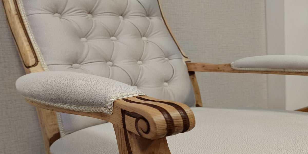 Cadeirão estofado em tecido bege com efeito capitonê. Madeira lixada e envernizada em tom mais claro em contraste com o escuro em baixo relevo.