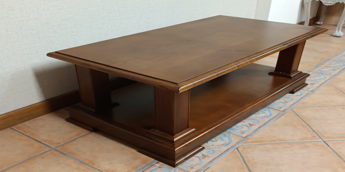 Mesa de apoio em madeira envernizada em tom mais claro e detalhes escurecidos