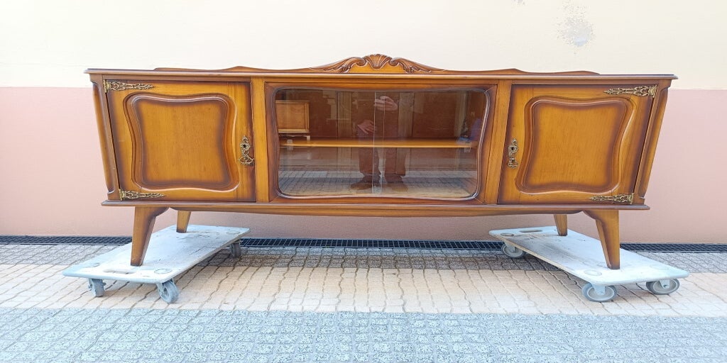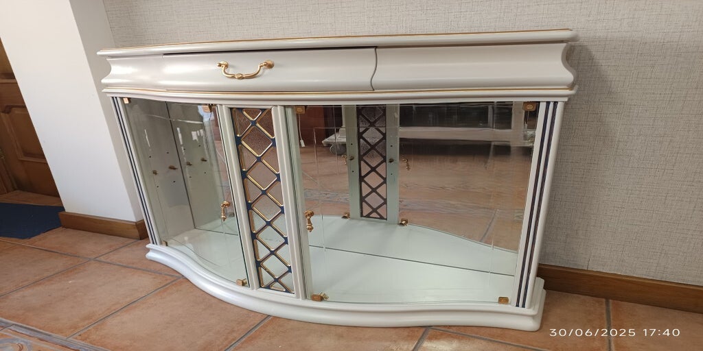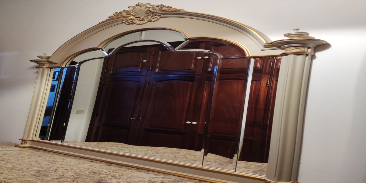 Aparador em bege com espelho, tampo em madeira envernizada e detalhes em dourado. Puxadores novos