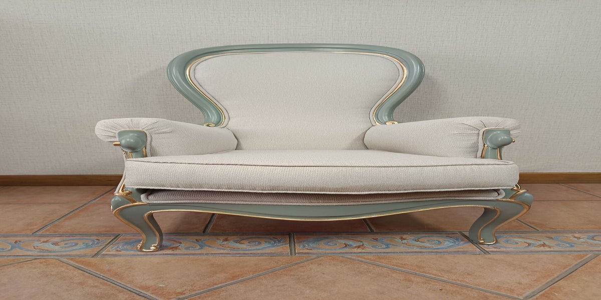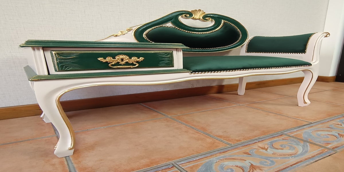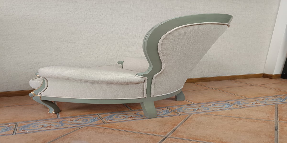 Namoradeira em bege e verde. Estofo novo em tecido aveludado verde e detalhes em dourado