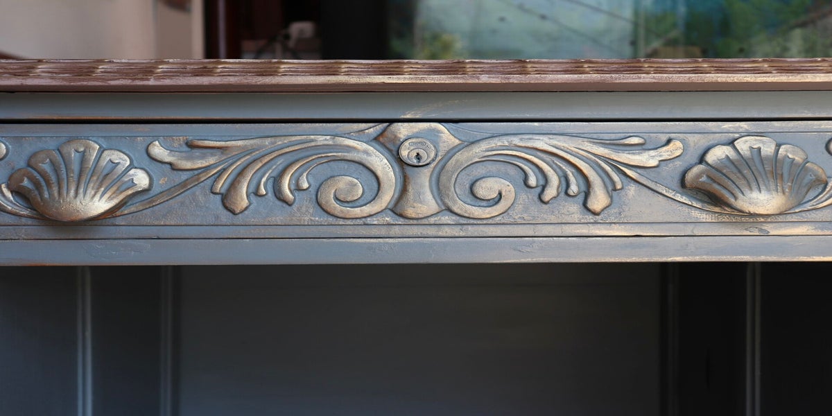 Aparador em cinzento com detalhes em dourado. Tampo em madeira envernizada.