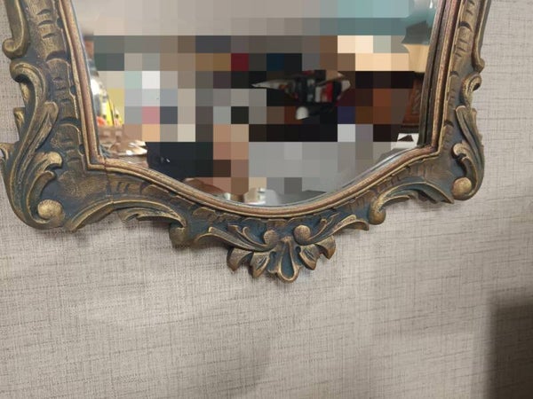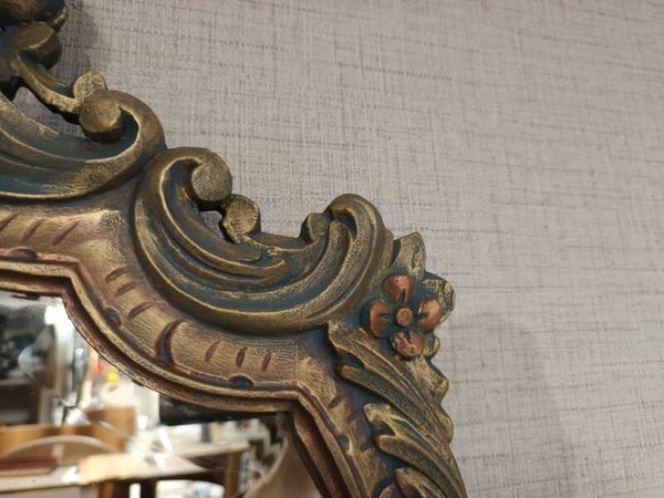 Espelho decorativo em estilo vintage, com moldura trabalhada e detalhes ornamentais. Apresenta acabamento clássico e design intemporal, adequado para salas, halls de entrada, quartos ou espaços comerciais. A moldura inclui elementos decorativos de inspiração tradicional, conferindo carácter e elegância ao conjunto.